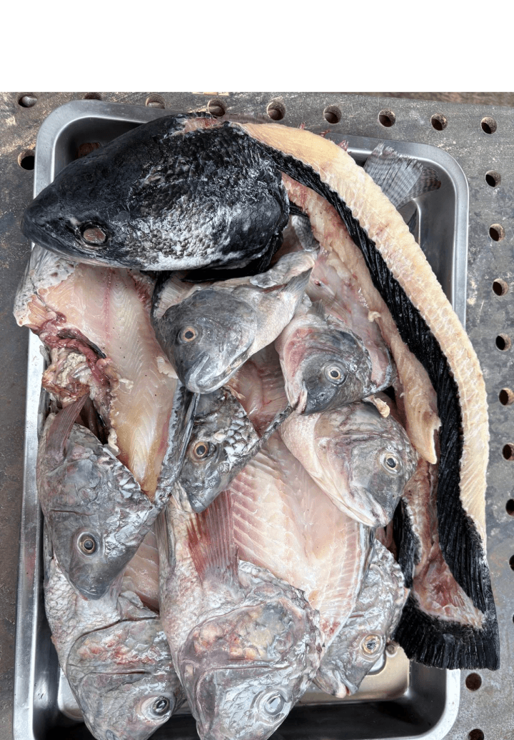 fish scales, fish heads & skeletons, food from dining plates, excess cooked