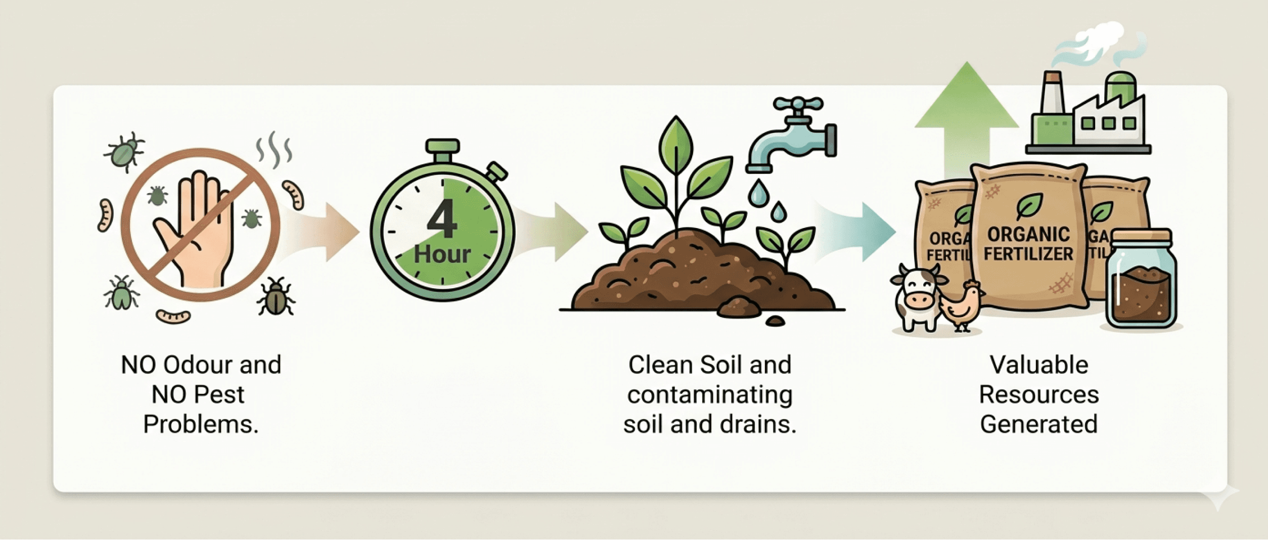 "Odourless · Near Bone Dry · Pathogen Free · Ready in 4 hrs"